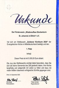 Der Glockenturmverein Ellrich hat nach dem Gewinn des Wettbewerbs "Mach dich ran" 2019 nunmehr den ersten Preis des Förderpreises "Goldener Kirchturm" gewonnen. Mit diesem Preis wird das außergewöhnliche Engagement des Vereins beim Umbau der St.Johanniskirche zur Netzwerkkirche und beim Aufbau des Turmes gewürdigt.