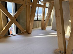Nach ersten Verzögerungen durch weitere konstruktive Anpassungen geht es nun mit dem Aufbau des Glockenstuhles zügig voran. Da sich die Glocken bereits auf dem Fußboden an ihren vorgesehenen Positionen befinden und zum Einhängen nur nach oben gehoben werden, bauen die Zimmerleute von antignum den Glockenstuhl quasi um die Glocken herum. Diese Arbeiten werden bis Ende Februar abgeschlossen sein.